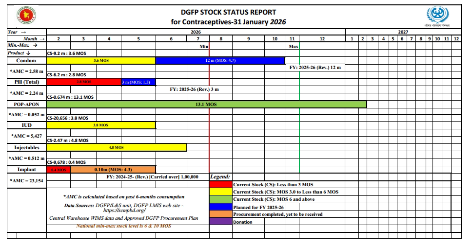 CONDOM – Current national stock is 9.2 million pieces, and this stock can be used up to Mid-May 2026 according to the current average monthly consumption. However, 7.7 million pieces of condoms received in December 2025 have been reflected in the national stock. These were procured under the ISO for HC & FDMN Project and are designated for distribution exclusively within the project areas.